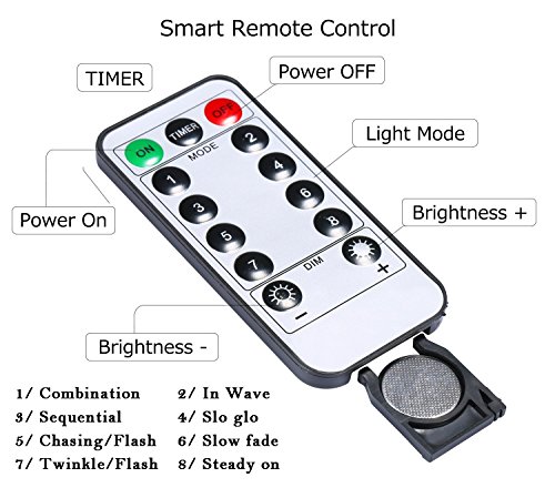 - 2. Remote controller lets you control the light remotely with 8 different modes (Combination/In wave/Sequential/Slo glo/Chasing/Flash/Slow fade/Twinkle/Flash/Steady on) for adjustable settings and 10 brightness levels.