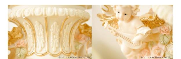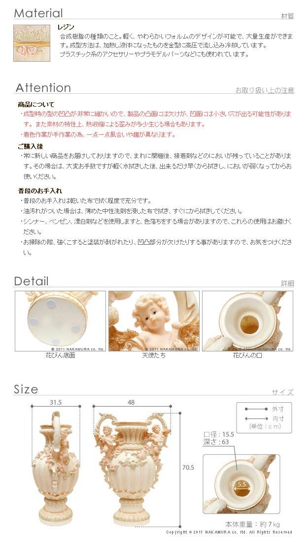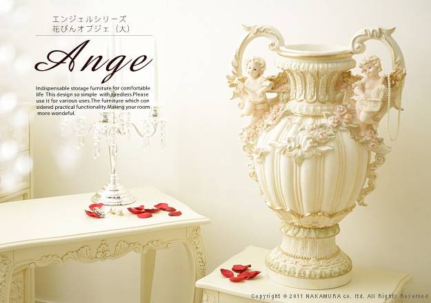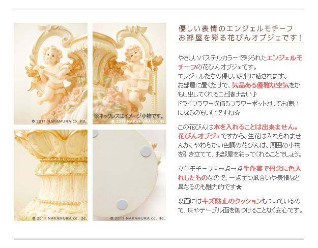 商品について:エンジェルモチーフの花瓶オブジェ。立体モチーフは一点一点手作業で色入れしたものなので、それぞれ趣きが異なるのも魅力的です。