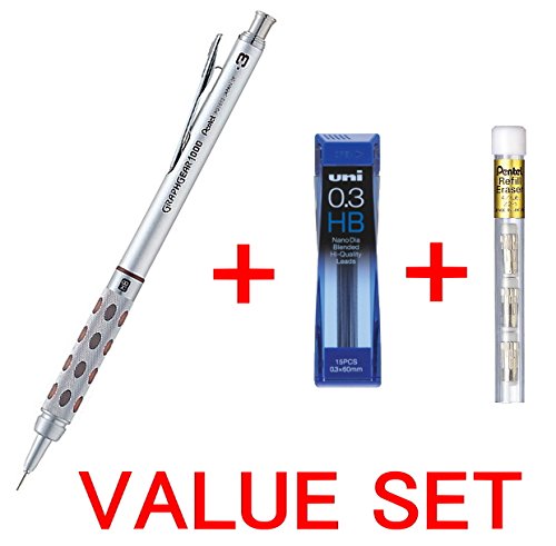 Pentel Graph Gear 1000 Automatic Drafting Pencil, 0.3mm Lead Size, PG1013 + 4 Refill Erasers + Strength & Deep & Smooth Uni 0.3mm HB Top quality Diamond Infused Leads [Nano Dia 15 Leads]