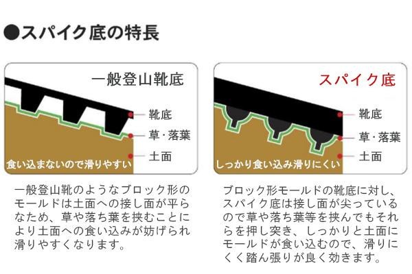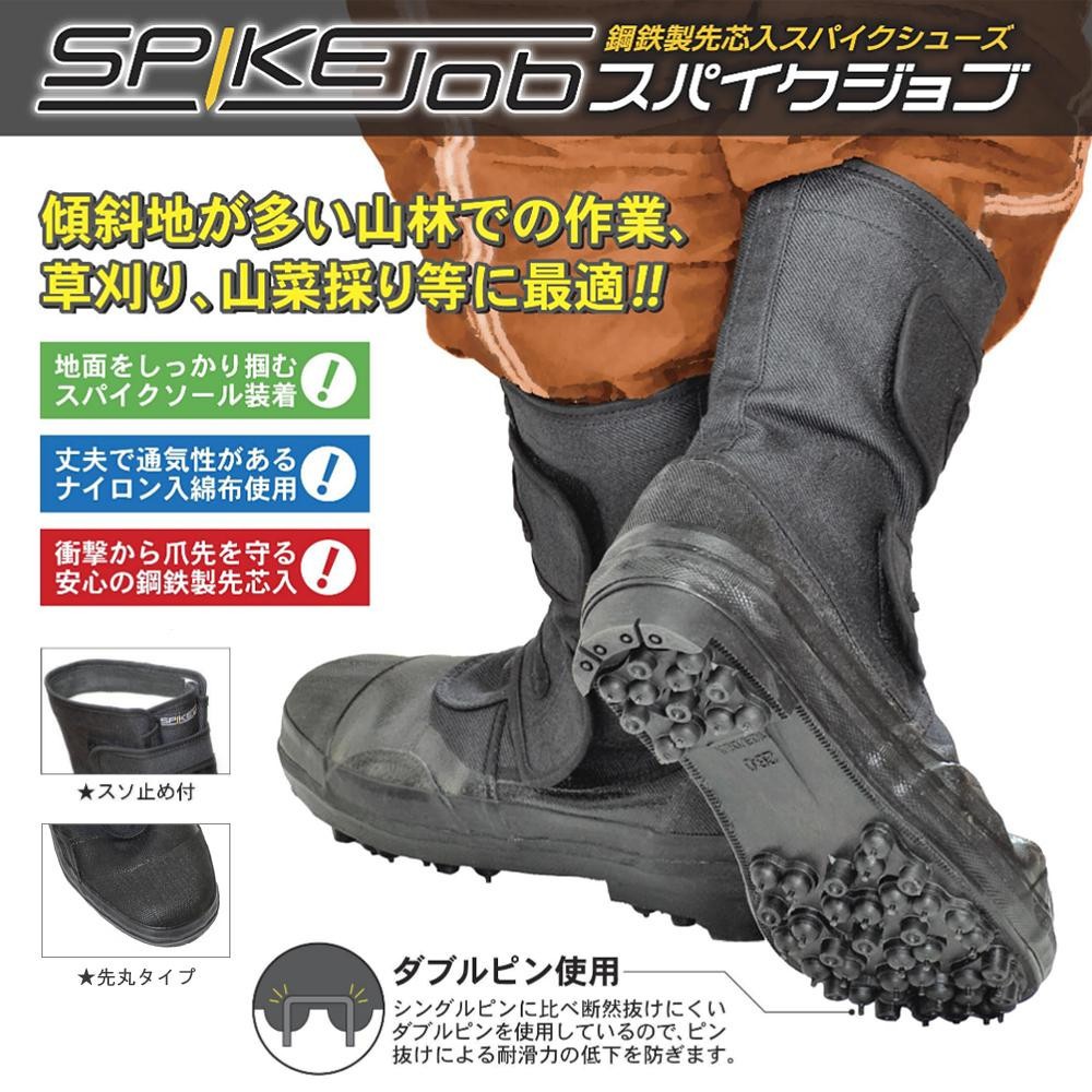 | 傾斜地が多い山林での作業、草刈り、山菜採り等に最適!!鋼鉄製の先芯入りなので衝撃からつま先を守りつつ、地面もしっかりつかむスパイクシューズです。地下足袋のようにしっかりと踏ん張りが効き、丈夫で通気性も◎。履き口にはズボンのスソ止めが付いており、靴からズボンが抜けにくい仕様になっています。 |