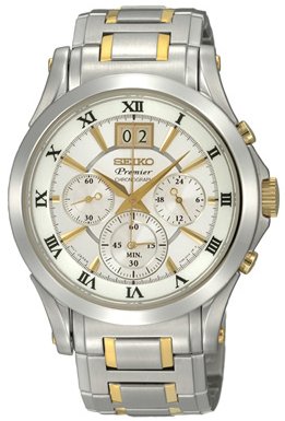 This timepiece by Seiko for men offers a two tone stainless steel case and link bracelet. The white dial includes a date window and chronograph function. This handsome watch also features a scratch-resistant hardlex crystal, a precise quartz movement, and a water resistance level of up to 100 meters (330 feet).Feature