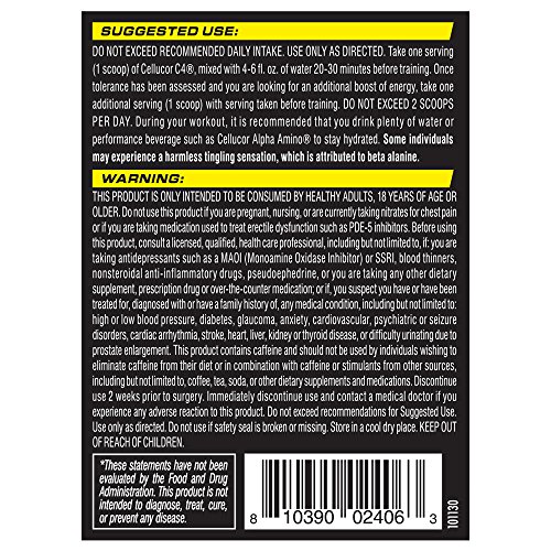 C4 Original is a pre-workout powder that energizes your workouts and takes your fitness to the next level. C4 Original's high-powered formula features a special blend of patented ingredients that put the edge in energy and performance. When to take C4: You need energy. You want to have a great workout. You want to push yourself to reach new goals. Why C4 Original? C4 Original's formula includes ingredients that help promote energy, pumps and performance. TeaCor for improved energy that comes on quickly and lasts longer. Beta Alanine: An amino acid that supports muscular endurance. Beta Alanine produces a tingly sensation throughout the body that lets you know it's working. Creatine Nitrate: Creatine bound to Nitrate. Creatine Nitrate produces two desirable effects on performance: Creatine for strength and Nitrate for pumps. N-Acetyl L-Tyrosine: It is a core part of the essential energy blend. It helps support peak mental and physical performance. Caffeine: A popular and proven source for energy. ‡Based on sales of C4 branded pre-workout products in the U.S.A. from 2014 to the present, C4 is America’s #1 Selling Pre-Workout.Feature