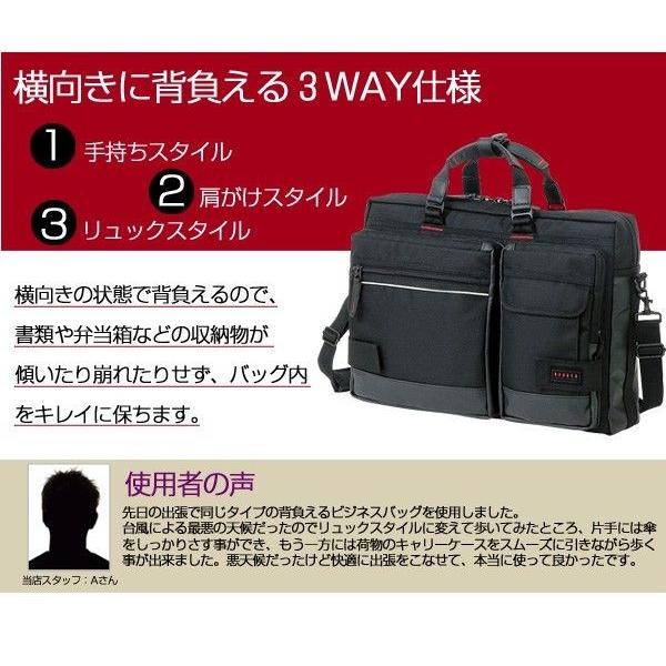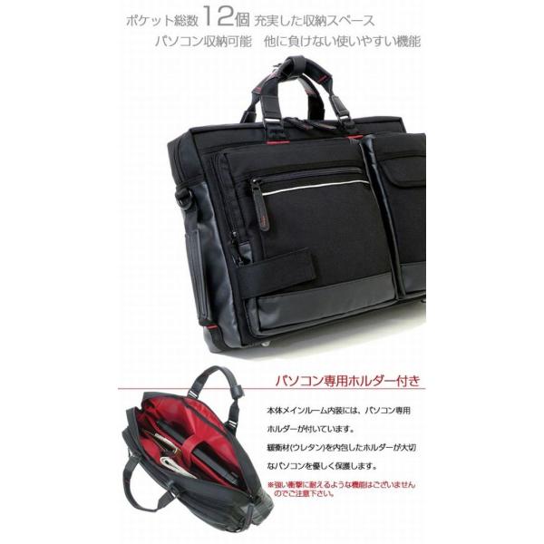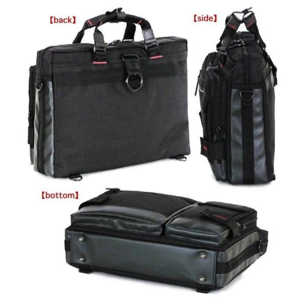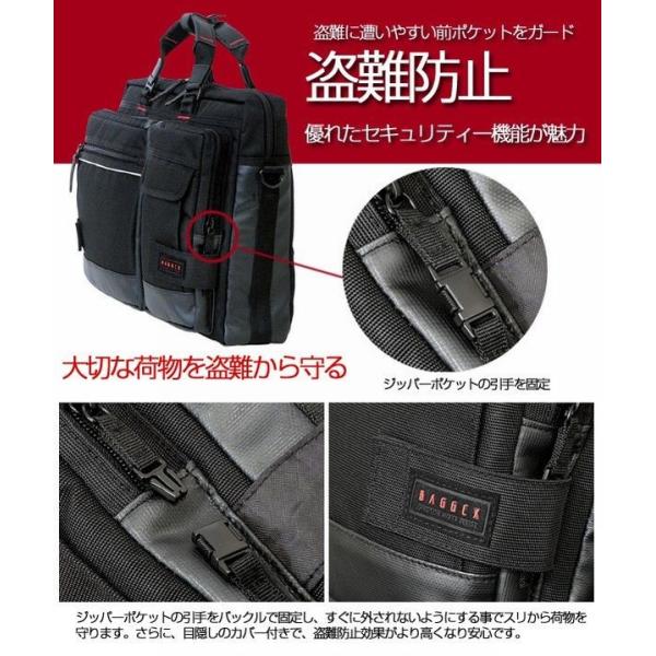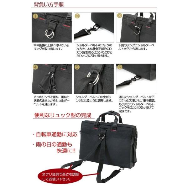 ■B4サイズ(257x364mm)収納可 ■ショルダーベルト付 ◆各部詳細◆ 1手持ち2肩がけ3リュック3通りの持ち方が可能 リュックスタイルは横向きに背負えるので書類やお弁当などの荷物が、キレイに保てる リュックにしない時はリングを専用スペースにスッキリと収納(実用新案登録出願済み) 盗難防止セキュリティー機能搭載 前ポケットの引き手をバックルですぐに外されないよう固定し、スリから大切な荷物を守る 目隠しのカバーは、盗難防止効果がより高く安心 ノートパソコンを優しく保護する緩衝材入りポケット付き 強い衝撃にも耐えうるような保護機能はありませんのでご注意ください キャリーオン可能 本体の背面はキャリーケースに取り付けられる仕様になっているので、出張時も楽ー 【本体外側】 ■本体前面ジッパーポケットx3 ■本体前面右側ジッパーポケット内オープンポケットx1 ■左側ジッパーポケット内オープンポケット(メッシュ製)x1 ■ペンホルダーx2 【本体内側】 ■オープンポケットx2 ■ジッパーポケットx1 ■パソコンホルダーx1 |