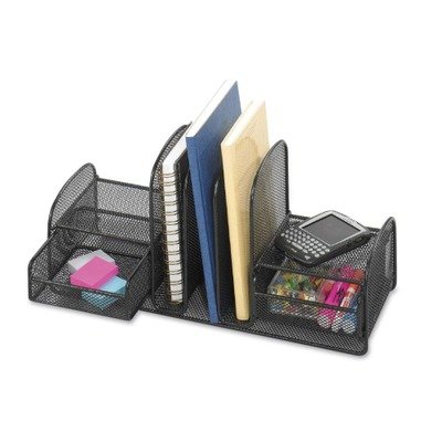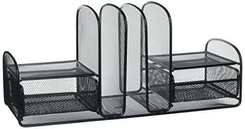 -. Feature : Sturdy steel mesh organizer with three vertical sections and two slide-out baskets. / Three vertical sections hold file folders and binders. / Two slide-out baskets corral small desktop items. / Sliding shelves are ideal for small electronics or accessories. / Durable steel mesh construction.