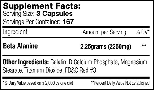 ReleaseDate : 2012-08-10 Studio : Serious Nutrition Solution Publisher : Serious Nutrition Solution Binding : Health and Beauty Product Description Increase Lean Muscle, Strength, and Endurance. Beta Alanine capsules can be used by weight trainers and endurance athletes to help boost intracellular carnosine levels which in turn may lead to increased endurance, lean muscle, and strength gains. Each serving of Beta Alanine caps provide 2.25 grams (2250 mg) of beta alanine per serving. 0