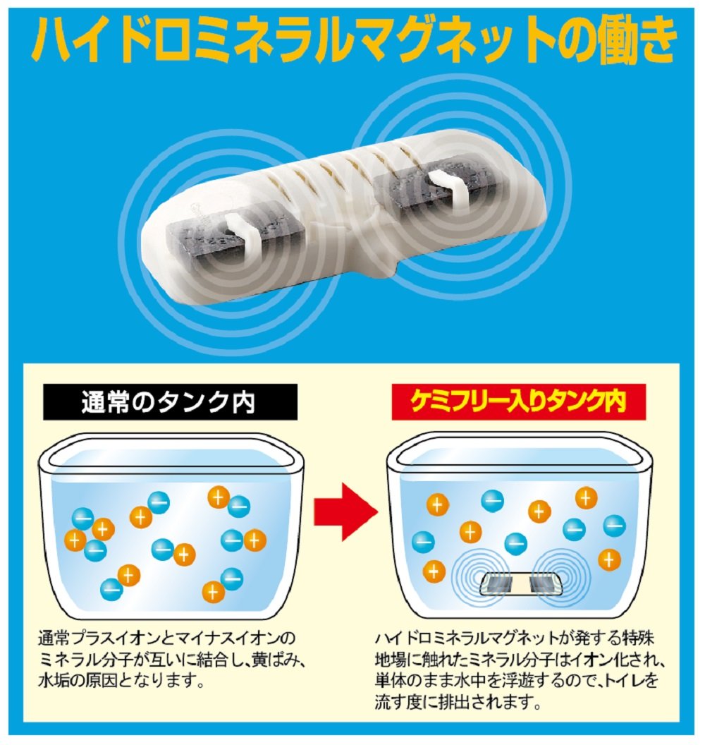 In the mechanism, water in the tank touches the magnetic field produced by the hydro mineral magnet, molecules such as mineral that is the source of water scattering ionize and it is easy to dissolve into water, and it will flow as a dirt that sticks to the toilet besides staying