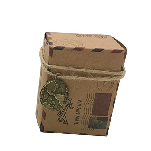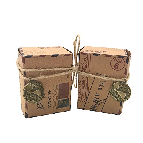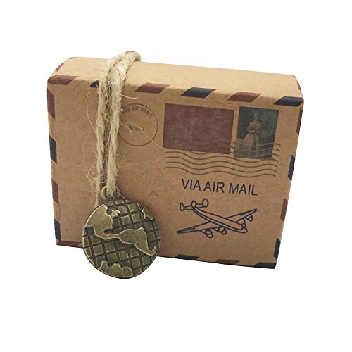 AmaJOY 50pcs Vintage Inspired Airmail Favor Box Bonbonniere Kraft Paper Boxes with Globe Decor Burlap Twines for wedding airplane inspired reception or travel themed events