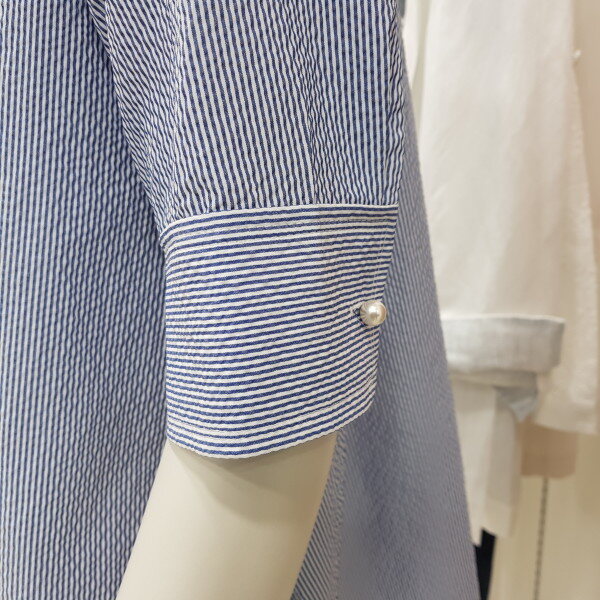 캐주얼하게 입기좋은 스트라이프 블라우스로 밑단에 홀이생러블리한 느낌으로 편하게 입기좋습니다