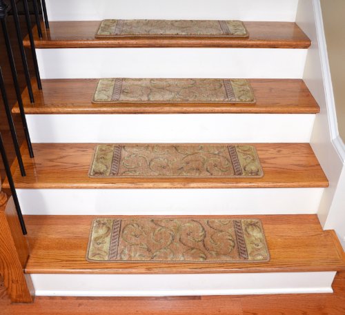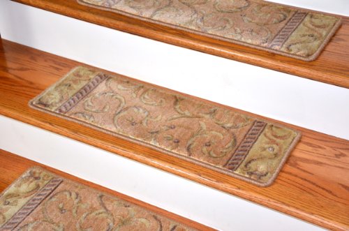 -. Brand : Dean Flooring Company -. Color : Peach -. Feature : Luxurious and Resilient Texture / High Fashion Design with Beautiful Scroll Work / Set Includes 13 Pieces / Approximately 26.25 inches by 9 inches / Each tread is machine serged with color matching yarn -. Label : Dean Flooring Company -. Manufacturer : Dean Flooring Company -. Model : ST34 -. MPN : ST34 -. PartNumber : ST34 -. ProductGroup : BISS -. ProductTypeName : LAB_SUPPLY -. Publisher : Dean Flooring Company -. Size : 26" x 9" -. Studio : Dean Flooring Company -. Title : Dean Premium Carpet Stair Treads - Peach Scrollwork (13)