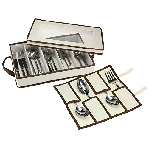 Studio : Household Essentials Publisher : Household Essentials Binding : Kitchen Product Description Flatware Chest with bonus Serving Pouch: it keeps flatware and silverware in good repair so you can use it longer. This storage chest is a long; hard-sided storage box divided into 5 compartments. Each compartment is ideally sized for your flatware: salad forks; dinner forks; soup spoons; dessert spoons; and knives each have their own well-proportioned place. The flatware storage chest comes with attached cloth handles for easy maneuverability. It also comes with a separate storage pouch for your serving utensils. The Flatware Chest supports up to 25 lbs.; so you really can store the good silver. Because of the sturdy cloth handles; the chest moves easily from closet to staging area; so you can set up your table with ease. It also has a window vision lid; so you can see what you have stored away. Easy to see means it is easier to choose the right flatware for every occasion. Whether you are storing your holiday silverware or your grandmother's flatware; you'll know exactly which set you have with a simple glance. As a wonderful bonus to your flatware storage chest; we have included the Serving Pouch-a quilted pouch that stores your serving utensils! Now; you can dish it out with your best preserved serving silver because you will always know where that serving spoon is. The serving pouch holds up to four items. It nestles serving utensils by alternating the direction each utensil lies; i.e.; the first handle to the right; second to the left; third to the right; and fourth to the left. When everything is ready; roll your pouch and fasten it closed with the attached hook and eye closure strips. Your serving gear stays protected and ready to use. Both the flatware storage chest and the serving pouch come in a clean; natural blended canvas that is durable and easy to clean; while still being gentle on fine dinnerware. Each piece features brown trim; an attractive accent that helps make storage appealing and practical. 0
