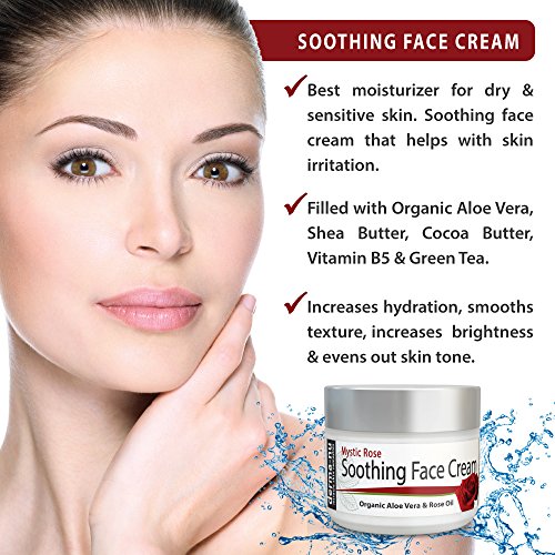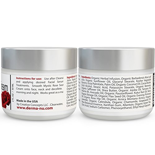 Derma-nu Mystic Rose Soothing Face Cream for wrinkles and Anti Aging has been formulated with ALL NATURAL and ORGANIC INGREDIENTS! It is the most effective skin daily moisturizer for dry or sensitive skin. The potent combination of ingredients are added in their highest potency and maximum percentage to make this truly an effective facial moisturizer. This All Natural and Organic facial moisturizer is the best skin treatment for sun damaged skin and boosts hydration to plump the skin reducing fine lines and wrinkles. Organic Aloe Vera, Shea & Cocoa Butter provide soothing moisture for dry and sensitive skin. While Green Tea, Vitamin B5 and other antioxidants fight wrinkles and aging skin. This is a must have product for everyone. All Natural and Organic Ingredients nourish the skin with essential benefits to make the skin hydrated, soft, smooth and glowing. This is the #1 best Anti Aging Face Cream for deep hydration, penetrates to the cellular level repairing and restoring the skins natural moisture balance. 100% Satisfaction Guaranteed. We guarantee that you will be very happy with your purchase of our Derma-nu Mystic Rose Soothing Face Cream. If you are not completely happy with your product, please let us know for a complete refund.Feature