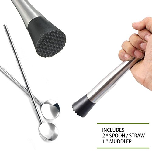 ★ Stainless Steel Muddler and Stainless Steel Stirrer Straw are dishwasher safe. ★ 2 pieces Stainless Steel Mixing Spoon Straw, reusable gadgets, IT'S TIME TO STOP USING PLASTIC ONE. ★ Extracts the last ounce of flavor from herb leaves, citrus fruits and dried spices, releasing it into your drinks. ★ BFA free hygienic groov ed nylon head. ★ Designed to fit smoothly in your hand. ★ One-year guarantee. ★ All pieces are easy-to-clean stainless steel and are dishwasher safe for quick cleanup. 0