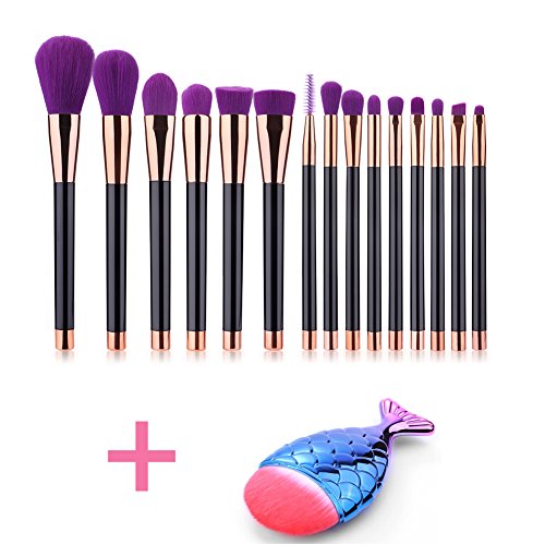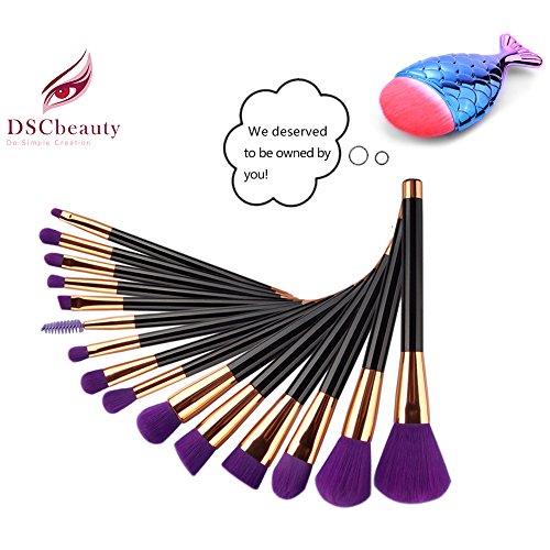 DSCbeauty 15 Pcs Makeup Brushes Set Plus 1pcs Mermaid Fish Shape Foundation Contour Blush Concealer Mascara Eyeshadow Blending Eyeliner Lip...