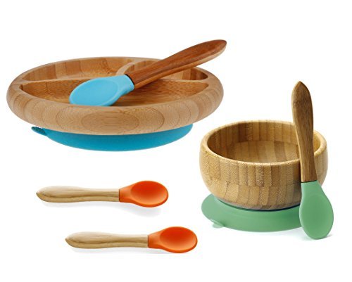 -. Title : Maven Gifts: Avanchy Bamboo Infant Feeding Set Featuring Stay Put Suction Bowl - Stay Put Divided Suction Plate - 4 Feeding Spoons