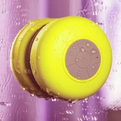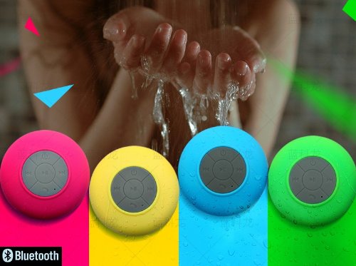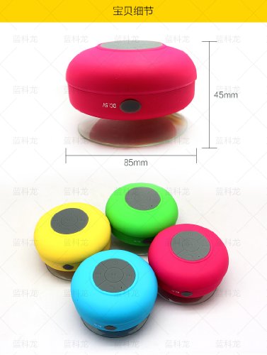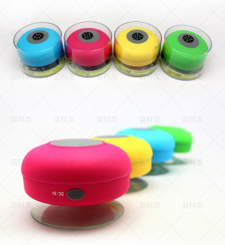 -. Feature : This is a high performance bluetooth wireless speaker/boombox for any mobile device with bluetooth capability / It can be use as a waterproof spearker in the shower room. (Do not immerse the speaker into the water!) There is a built-in microphone, so you can enjoy hands-free phone calls and music while in the shower, at the pool, or in the car / There is a large suction cup attached to the bottom of this device so that it can grab on to any flat surface such as shower, door, windows, tables, pool linings / Don't let the soft shower colors fool you! This little guy reproduces great sound with strong bass / The high capacity lithium battery inside allows long play time (upto 6 hours) on a single charge.