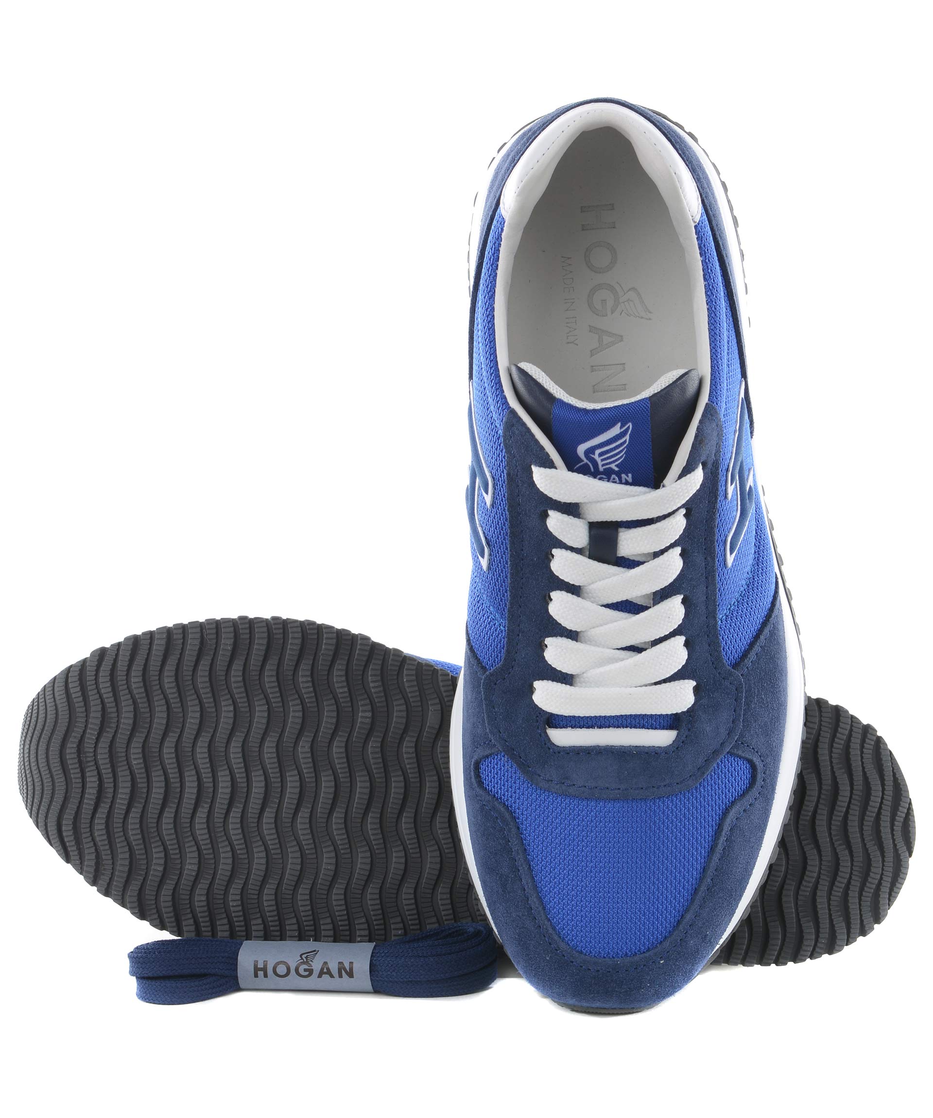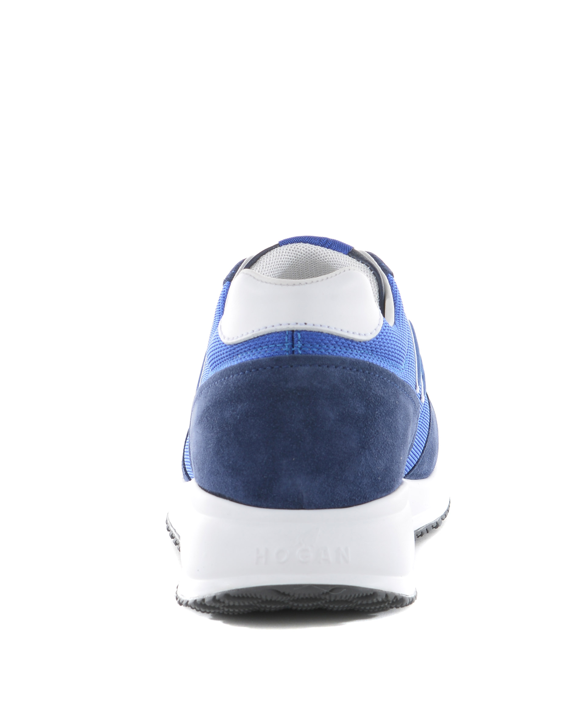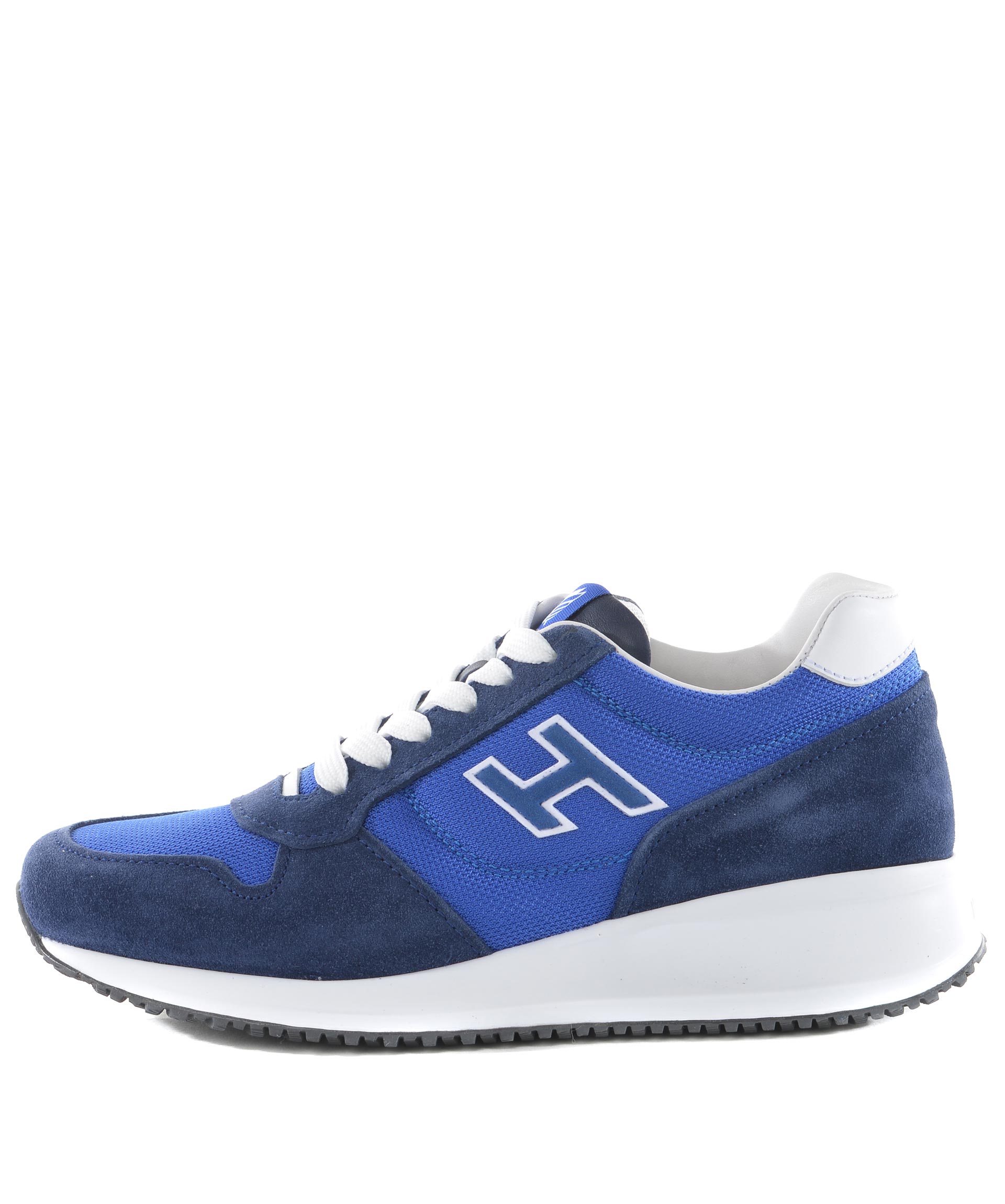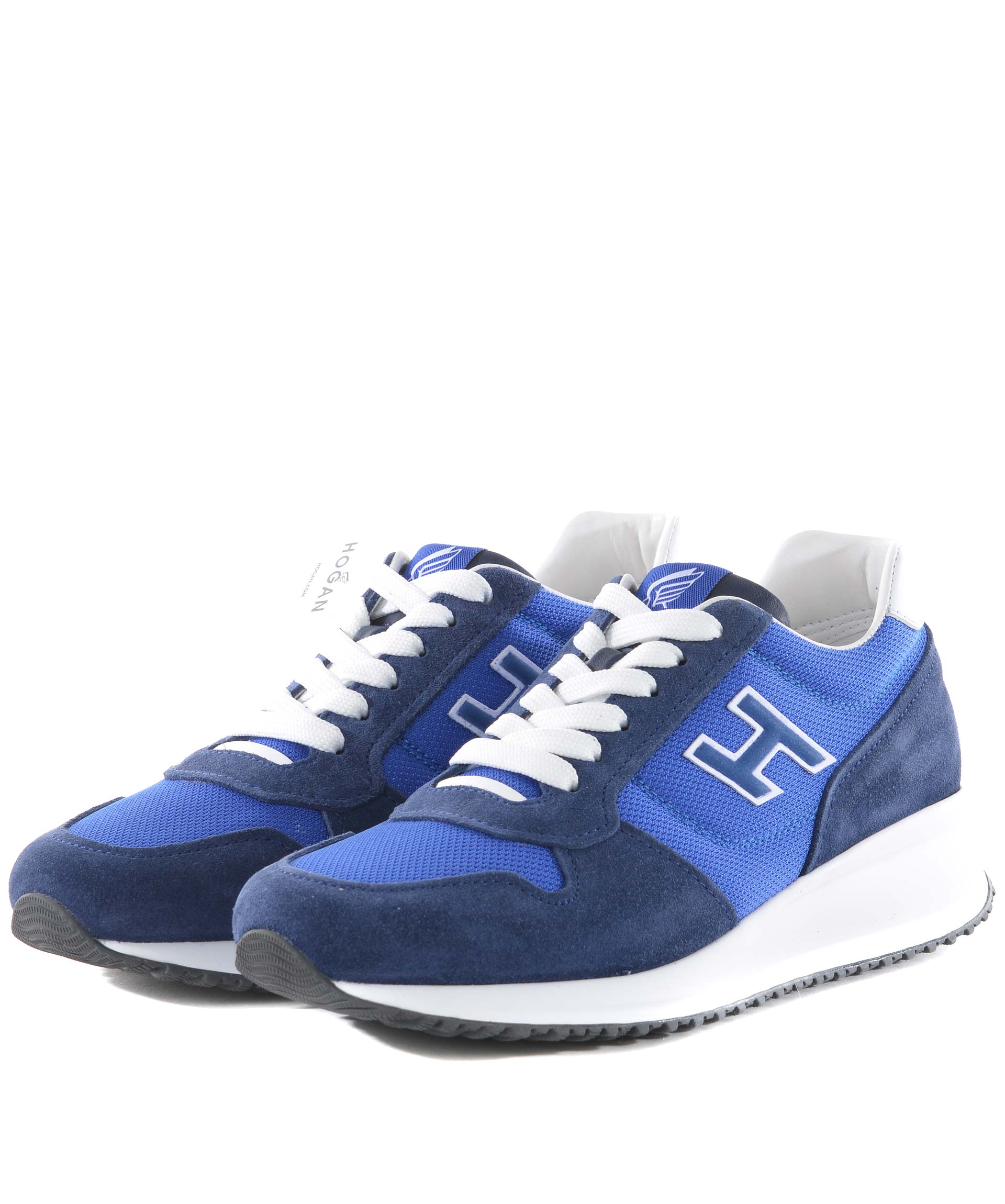 Sneakers Hogan Interactive N20 in camoscio Blu e nylon Cobalto. H laterale bicolore applicata. Inserto in pelle bianca sul tallone. Suola in gomma. Etichetta logo sulla linguetta. Stringhe a contrasto. Stringhe blu in dotazione.