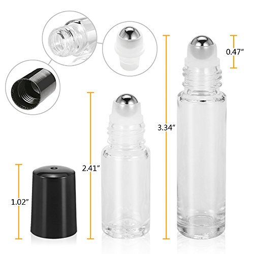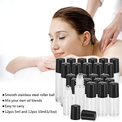 - 12 pack 10ml clear glass roller bottles and 12 pack 5ml amber glass roller bottles with stainless steel roller balls, which is BPA free, refillable, durable, economic, easy to use.