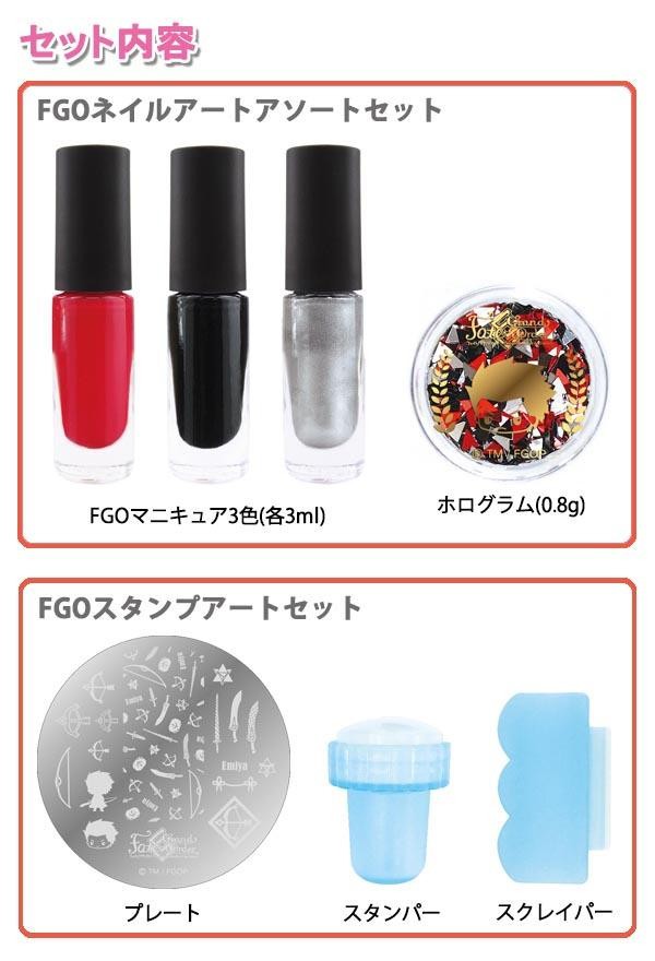 | セット内容 | 【FGOネイルアートアソートセット】 FGOマニキュア3色(各3ml)、ホログラム(0.8g) 【FGOスタンプアートセット】 プレート、スタンパー、スクレイパー |