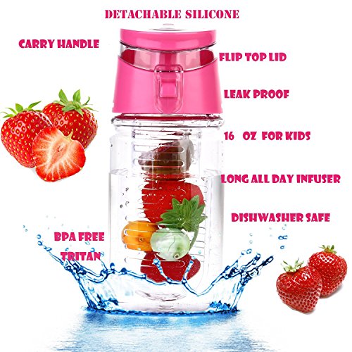 - • IDEAL FOR OUTDOOR AND INDOOR: the 450ml fruit infuser for kids is very Ideal for outdoor use and designed to give kids a firm grip when handling the bottle, it is made of squeezable TritanTm plastic it can fit into small compartments in school bags, straps and kits, very handy and durable, the fruit infuser also can withstand pressure when it is falls.