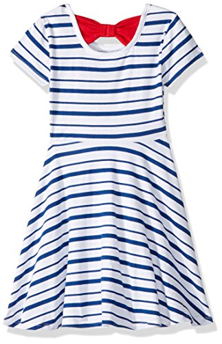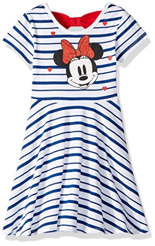 Your little one will never want to take off this cool minnie mouse graphic cap sleeve dress. This bright screen printed A-line dress features a smiling minnie mouse head surrounded by hearts. The entire dress is covered in horizontal stripes, red glitter and a keyhole opening in the back with a bow design completes this trendy dress.Feature