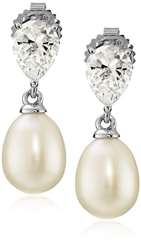 Sterling Silver Freshwater Cultured Pearl with Marquise Cut Cubic Zirconia Drop Earrings
