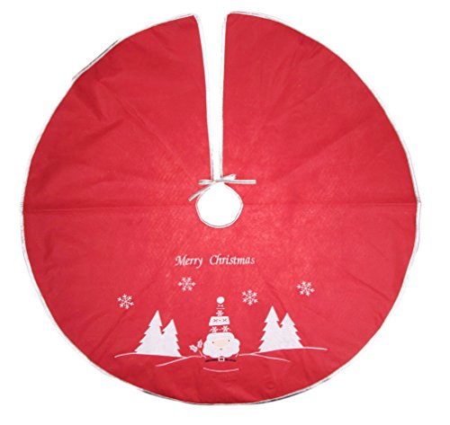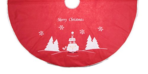 LOOKS GREAT: This red and white Christmas tree skirt features Santa standing by Christmas trees and the phrase "Merry Christmas" written on the front .