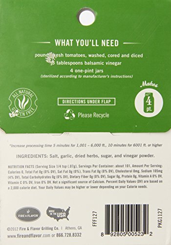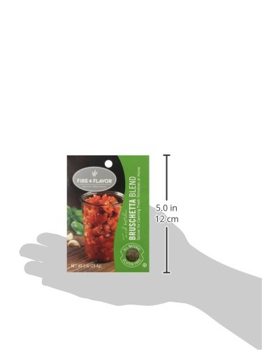 -. Binding : Grocery -. Brand : Fire and Flavor -. EAN : 0892805005232 -. Feature : Bruschetta canning spice blend that makes it easy to create a uniquely Italian treat at home / Makes 4 pints of canned tomatoes / Easy to use, just add combine with diced tomatoes and balsamic vinegar / All natural and gluten free / Made in the USA -. Label : Fire & Flavor -. Manufacturer : Fire & Flavor -. Model : IP--160 -. MPN : IP--160 -. NumberOfItems : 1 -. PackageQuantity : 1 -. PartNumber : IP--160 -. ProductGroup : Grocery -. ProductTypeName : GROCERY -. PublicationDate : 2013-04-03 -. Publisher : Fire & Flavor -. Size : 1 Ounce -. Studio : Fire & Flavor -. Title : Fire & Flavor Canning Seasoning, Bruschetta Blend, 1 Ounce -. UPC : 892805005232
