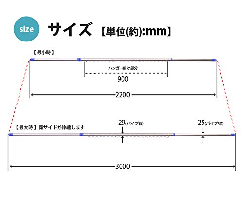 丈夫な鋼管に清潔なステンレスを被覆した2重構造パイプ 両端伸縮で、スペースに合わせて長さが自在 しっかり太い29mmパイプで安定感バツグン 風でハンガーがずれない ハンガーかけ付き