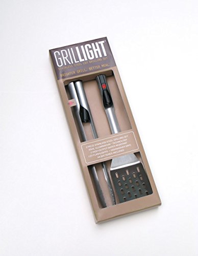 - Set of 2 stainless steel grilling tools set with LED flashlight built into the handles; includes: spatula and tongs