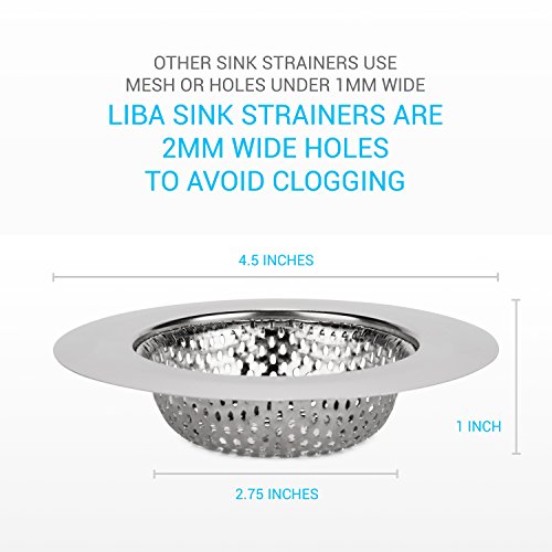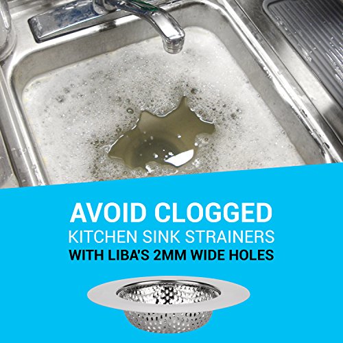 - TIRED OF CLOGGED SINK STRAINERS? - Most sink strainers have 1mm or smaller drain holes which end up clogging the sink. LiBa’s sink strainer has 2mm diameter holes to let fine particles pass through. This means no more fishing around dirty water with your hands to unclog the drain.