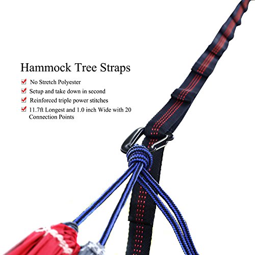 No Hassle of Tying Knots and Easier Setup: Come with two tree-friendly hanging straps which make it easy to set up your hammock whether in the wilderness or in your own backyard; 20 attachment loops on each hanging strap (40 total) makes it easy to install safely without the need of tying knots and worrying about rope fraying