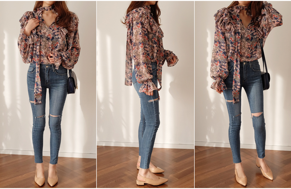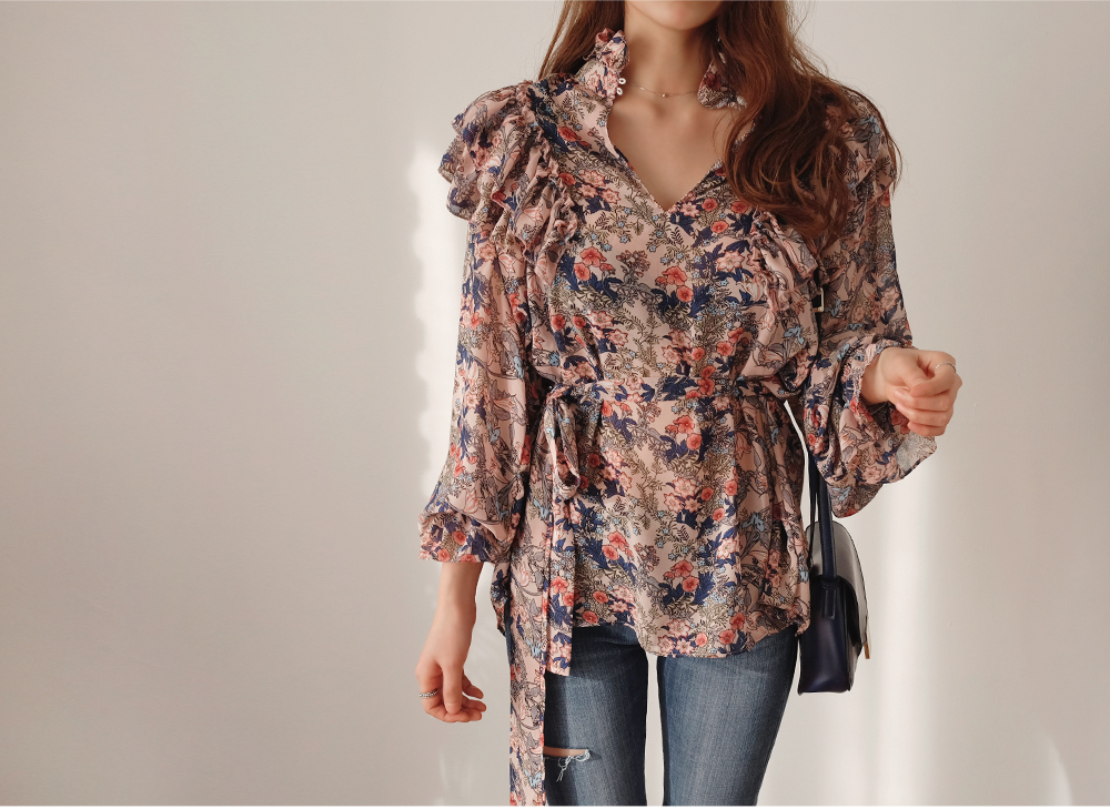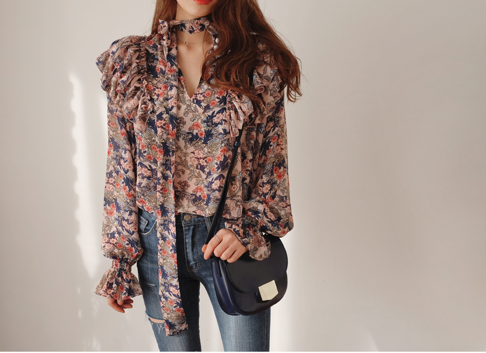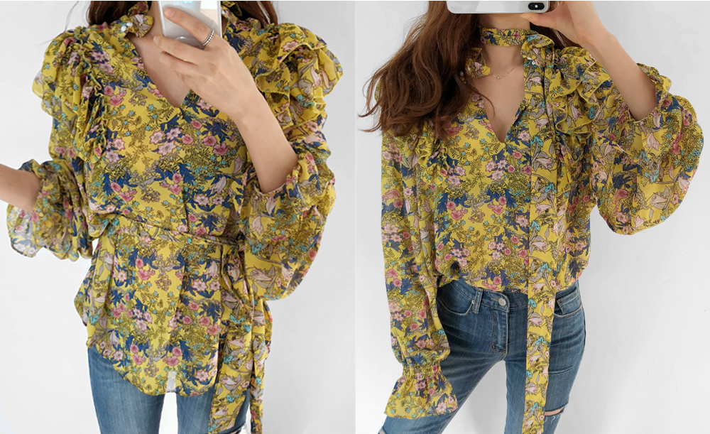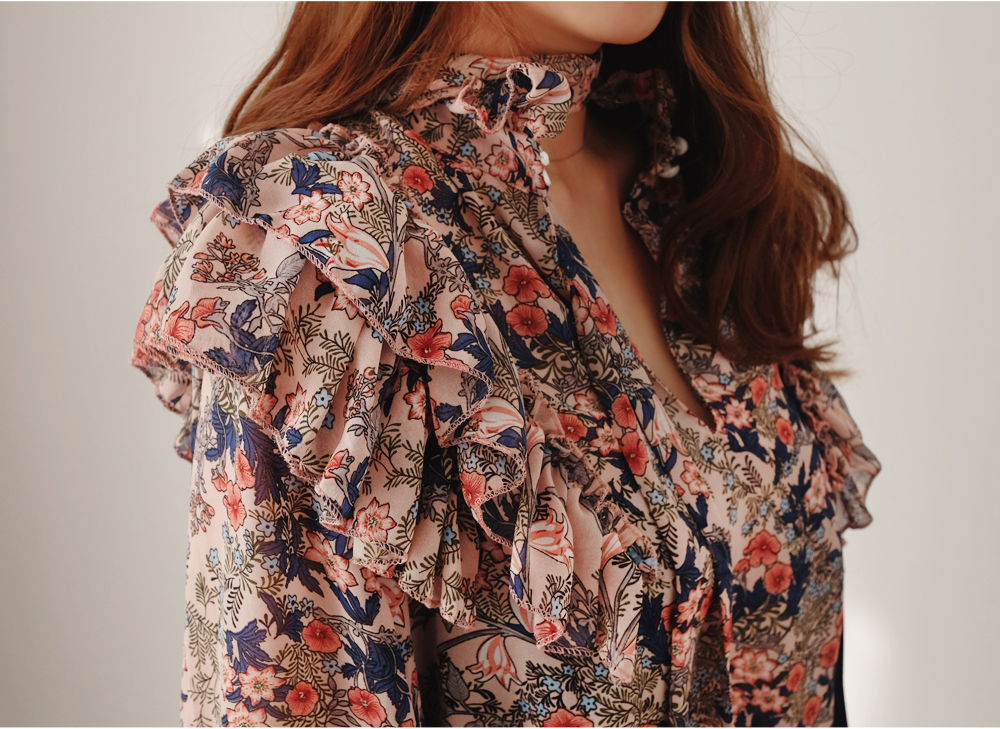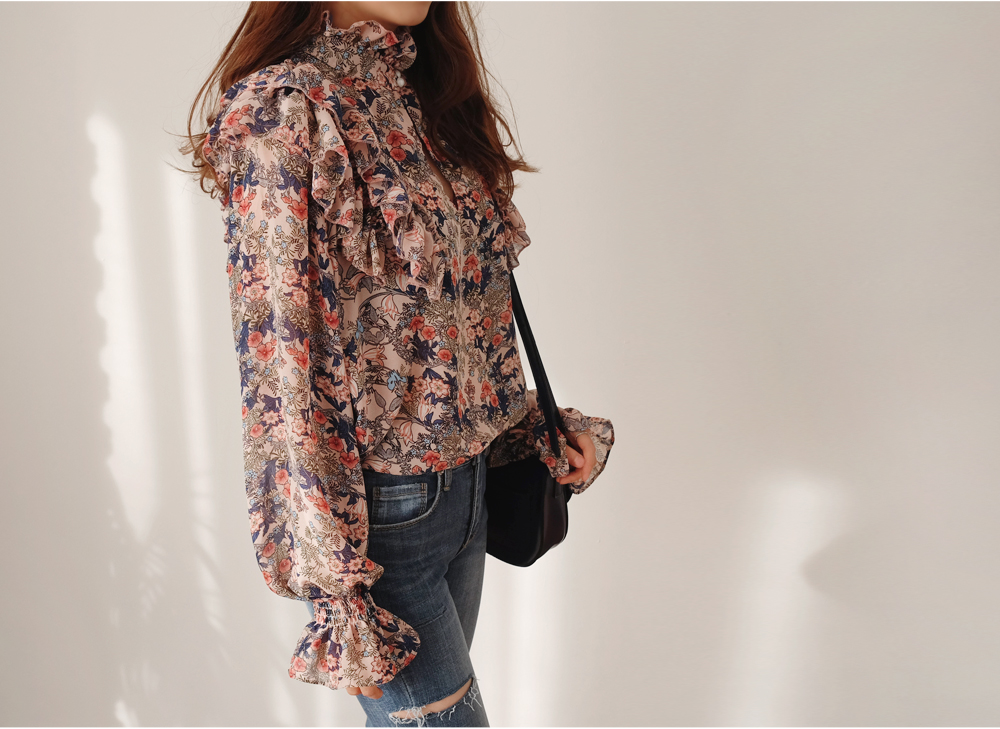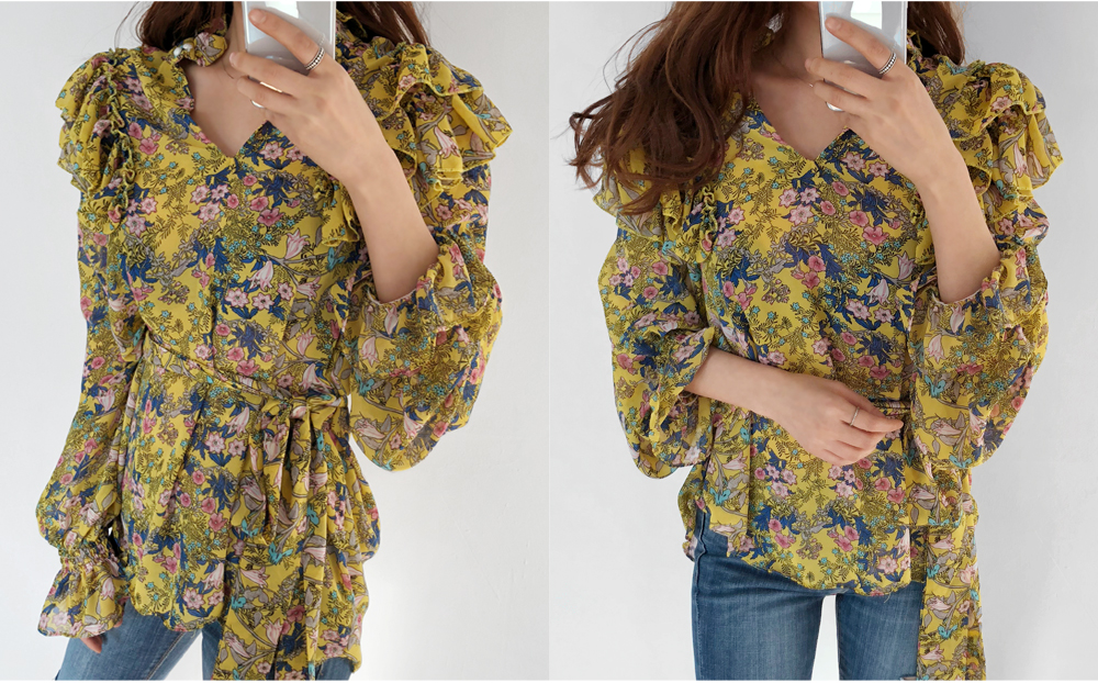 실키한 터치감과 풍성한 러플 디테일이 돋보이는 블라우스에요.