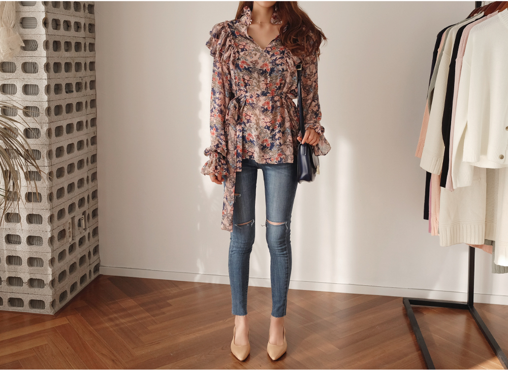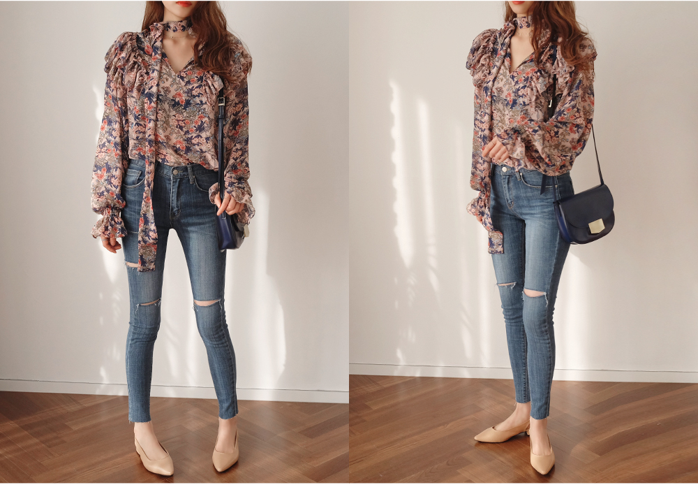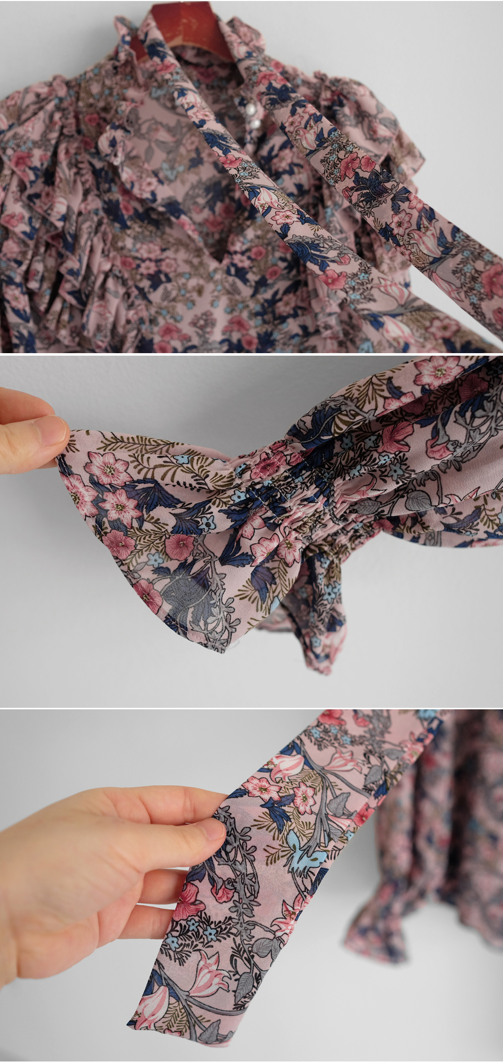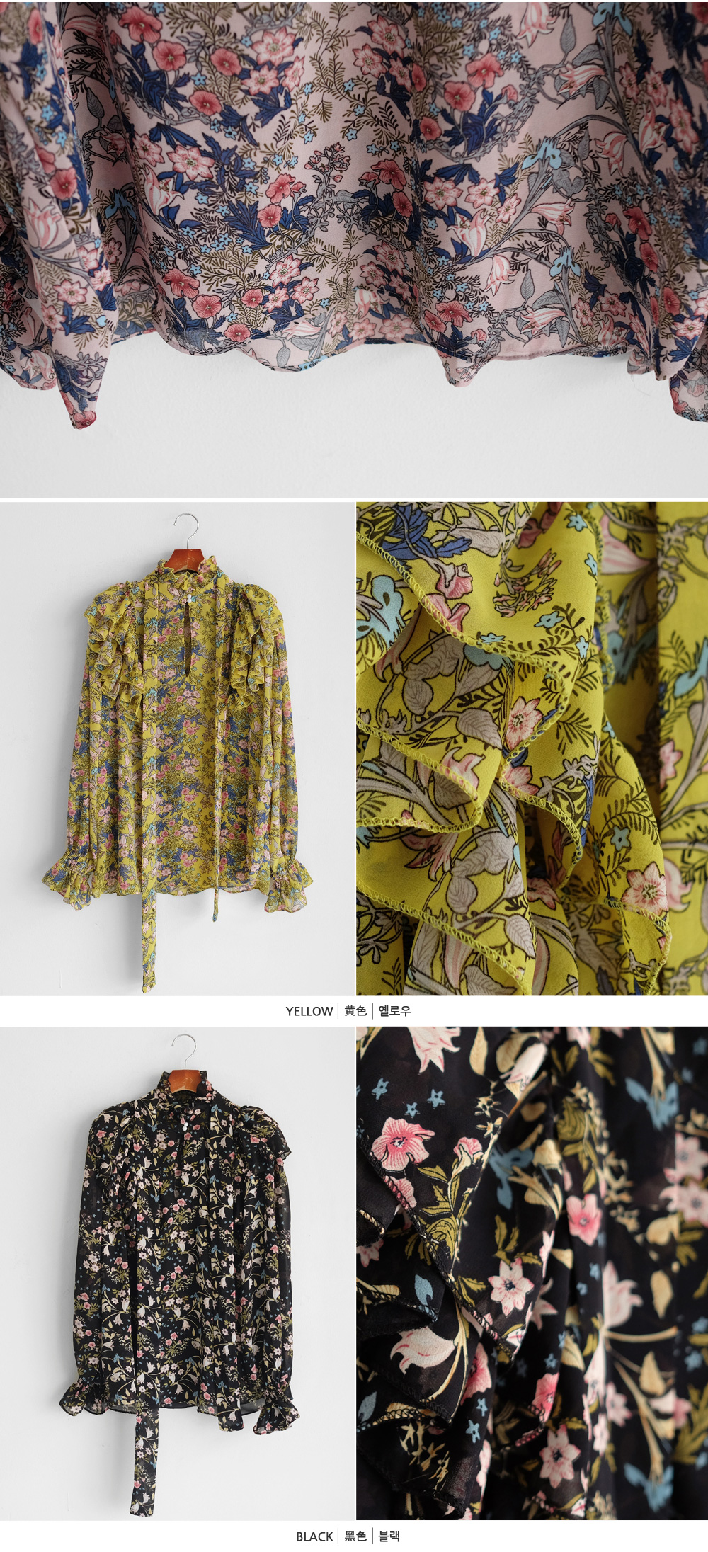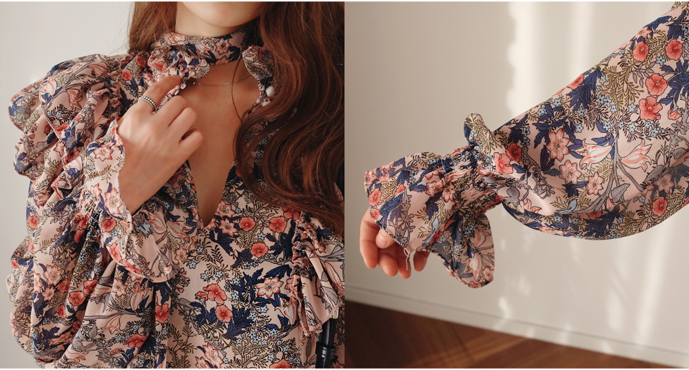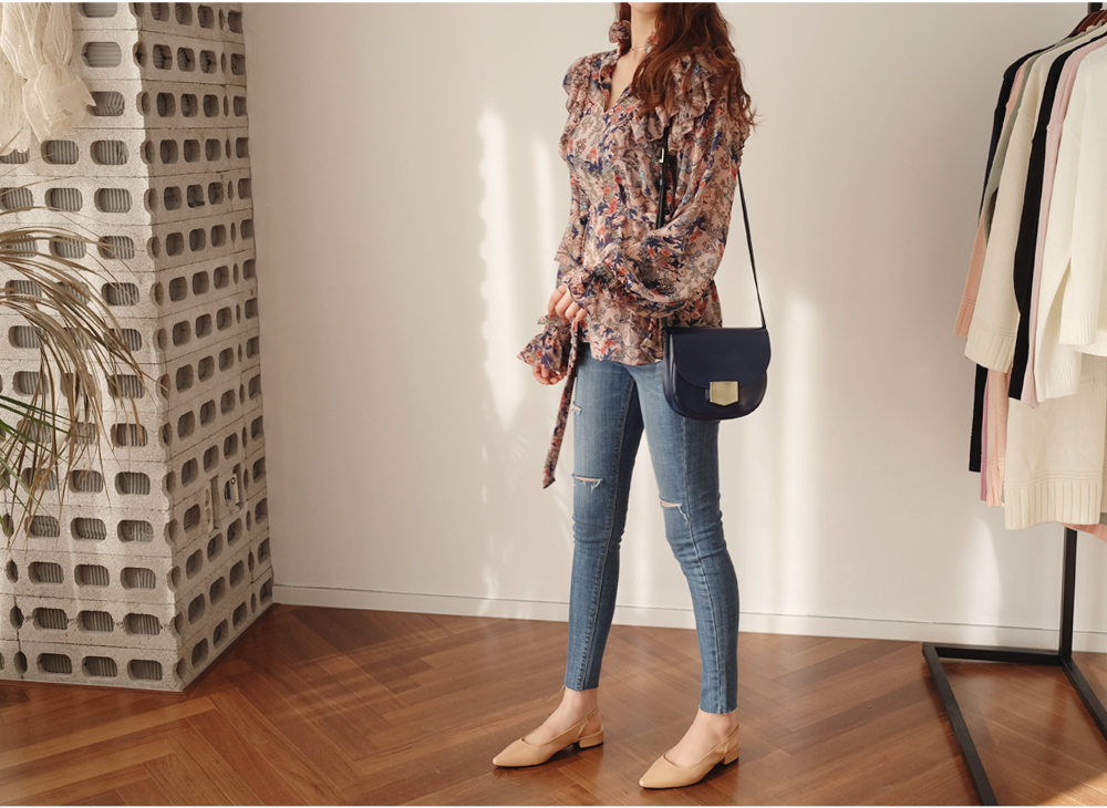 실키한 터치감과 풍성한 러플 디테일이 돋보이는 블라우스에요.