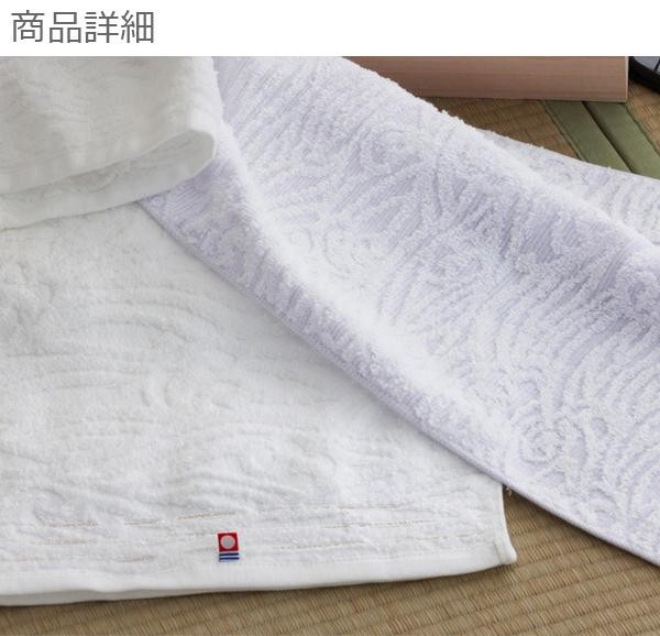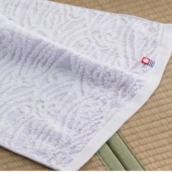 来島海峡の波模様と雲をイメージしたジャガードの柄で、淡い紫のグラデーションが素敵なデザインです。パイル部分に緩く撚り上げた国産紡績糸を使用したやわらかな風合いで、敬老の日やお歳暮におすすめです。 |