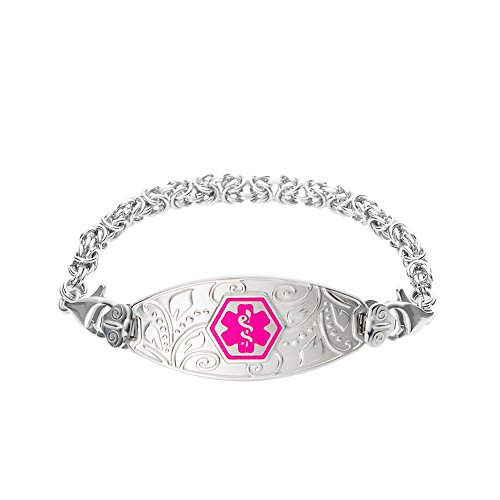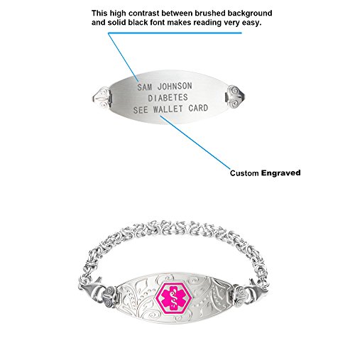 -. Binding : Jewelry -. Brand : Divoti -. Department : womens -. Feature : Easily provide your custom engraved content by selecting the CUSTOMIZE NOW button to the right. / Custom engraved in high contrast black laser engraving to personalize your medical message (on back : 4 lines of 18 characters, spaces included) / Hypoallergenic 316L medical alert bracelet and comes with size options 6.0-8.5 inches. / Deep embossed caduceus symbol with hard enamel filled on the front of medical alert bracelet. Excellent wear resistance. / Includes free customizable medical alert wallet card, medical alert smartphone apps and Velvet gift bag. -. Label : Divoti Inc. -. Manufacturer : Divoti Inc. -. Model : 5111VI -. MPN : 5111VI -. PartNumber : 5111VI -. ProductGroup : Jewelry -. ProductTypeName : FASHIONNECKLACEBRACELETANKLET -. Publisher : Divoti Inc. -. Studio : Divoti Inc. -. Title : Divoti Custom Engraved Lovely Filigree Medical Alert Bracelet -Handmade Byzantine-Violet