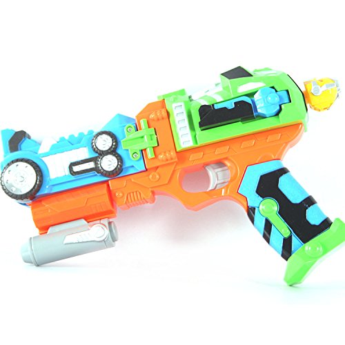 -. Feature : Challenging and active toy for younger children. It involves physical exercise, aiming skills, observation and stamina. / Meet the health requirements, color non-toxic, easy to clean and disinfect / Includes a gun, a darts clip with 14 darts and a pair of goggles protecting children's eye / Vibration with firing and realistic sound provide an authentic atmosphere of battle / Two modes for change: robot mode and soft bullet gun model; max range is over 20m