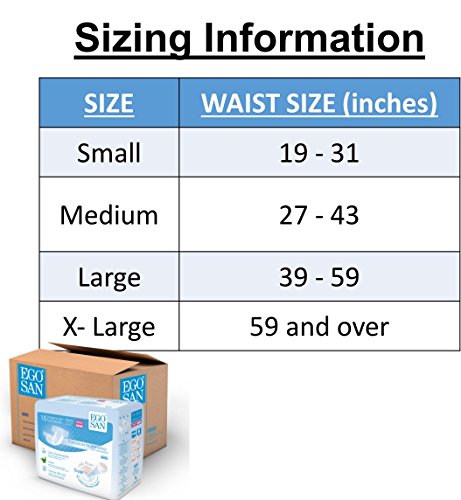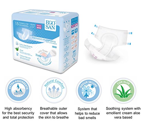 WHY CHOOSE THE EGOSAN MAXI DIAPER: Our diapers have been designed with premium materials that allows the skin to breathe through its ultra-lightweight and breathable non-woven fabrics. This feature ensures comfort thanks to the type and softness of materials and an efficient system of elastics: they adhere gently to the body and prevent the escape of liquids. The use of superabsorbent polymers also allows an effective odor control and the high absorption speed moves moisture immediately away from the skin of the patient. The care giver is cleverly alerted by an effective moisture indicator when it is time to replace the diaper. 0