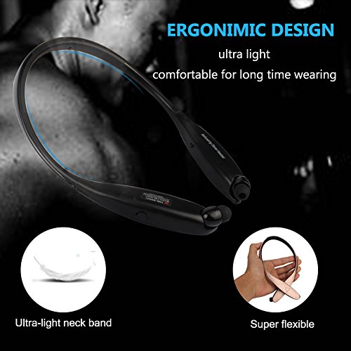 Feature : [RETRACTABLE EARBUDS]-- Bluetooth Headsets with retractable wire management keeps you away from wire mess, good for outdoor sports and indoor home leisure. Really set your hands free. IPX4 sweatproof, set free from worry of sweat damage while working out. / [HIGH CLEAR SOUND QUALITY] -- Built-in microphone with CVC6.0 noise cancellation and Echo Cancellation reduce background noise so you won't miss any important details from your phone calls and enjoy HiFi stereo music in daily life / [ADVANCED CSR BLUETOOTH 4.1] -- Supports Faster Pairing with One or two bluetooth devices at one time. Compatible with iPhone, Android, Windows Phone. / [VOICE PROMPT AND VIBRATION] -- Voice And Vibration alarm when call comes in or pairing successfully,battery low/high. Power on/off, assisting you never to miss any incoming calls while busy with other stuff and mater your headphones status conveniently. / [SPORTS DESIGN] -- Ultra-light ergo-fit headset ensures the headphones stays stable in ears and brings not any burden on neck while in gym, running, jogging riding bikes or other sports. Durable battery performances 15 hours of talk time, 12 hours of music and 500 hours of standby with a full charge.