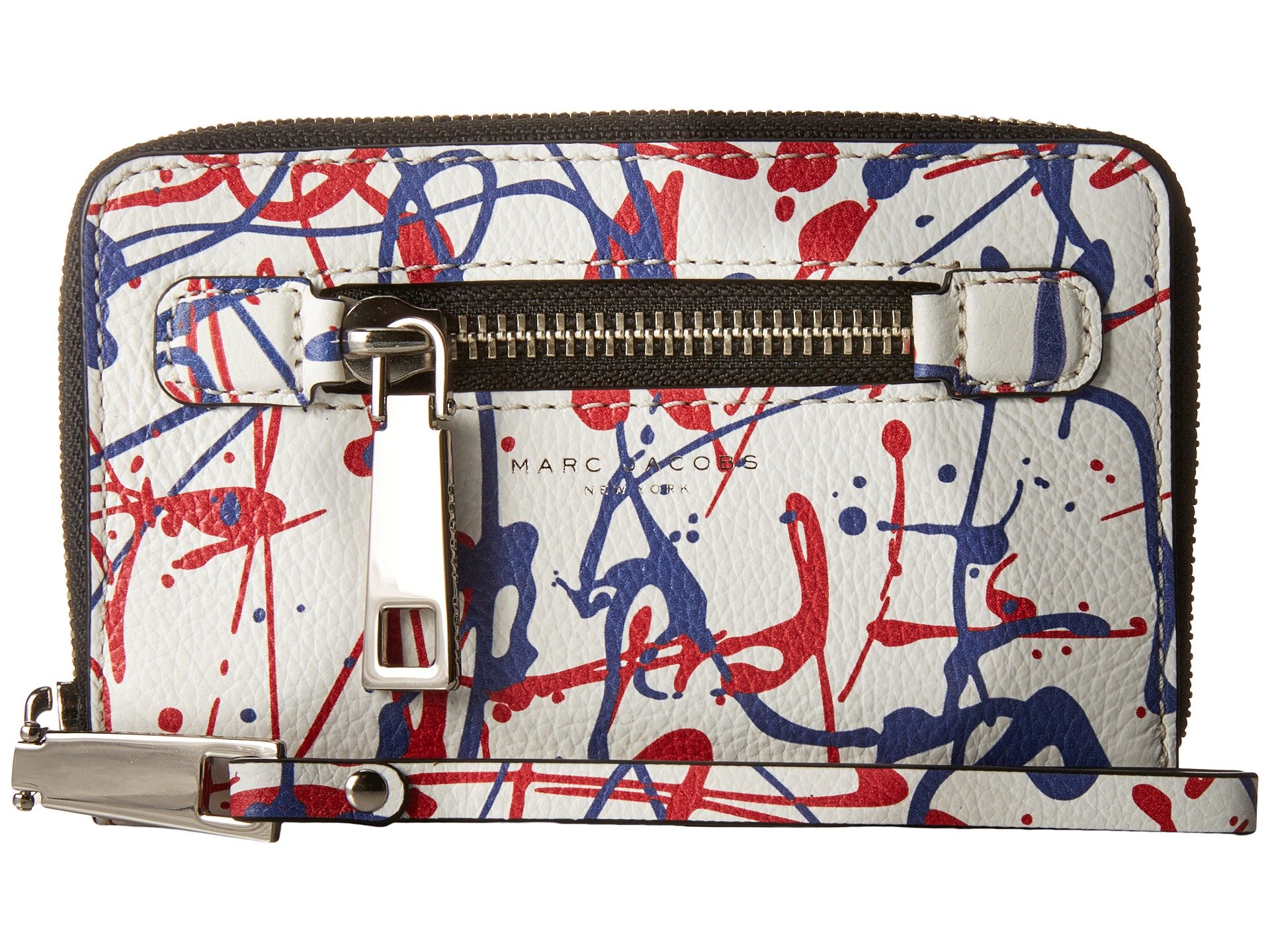 | Product Information SKU: #8719889You have a busy day! Make it easy carrying the Marc Jacobs? Splatter Paint Zip Phone Wristlet and have all your essentials at the ready. Wristlet made of leather. Zip-around closure. Wristlet strap. Allover splatter paint print. Front exterior zip pocket. Brand name embossed at front. Leather lined interior features slip pockets, credit card slots and phone slot compatible for iPhone? 6. Imported. This item may ship with an attached security tag. Merchandise returned without the original security tag attached or a damaged tag may not qualify for a refund.This product may have a manufacturer's warranty. Please visit the manufacturer's website or contact us at warranty@support.zappos.com for full manufacturer warranty details.Measurements: Bottom Width: 6 in Depth: 3?4 in Height: 3 3?4 in Strap Length: 15 in Strap Drop: 8 in Weight: 6.4 oz |