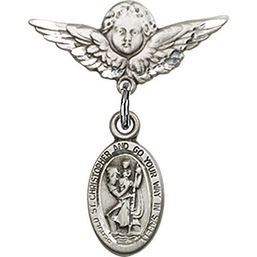 -. Title : Sterling Silver Baby Badge with St. Christopher Charm and Angel w/Wings Badge Pin 7/8 X 3/4 inches