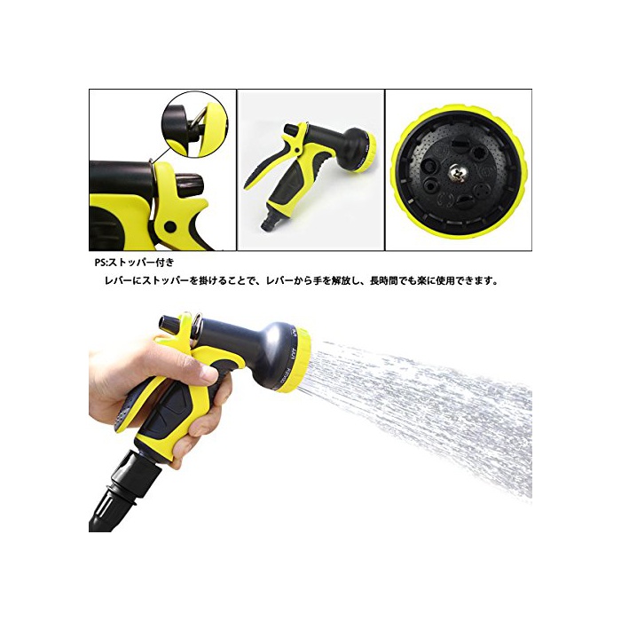 【살수 노즐】9패턴의 살수 타입이 있고, 눈앞의 다이얼에 간단하게 바뀌는 때문에,여러가지 씬 에 따라 사용으로 옵니다.힘을 생략할 수 있는 바와 같이(하도록),레버에 스토퍼를 걸어(걸쳐) 장시간에서도 편안히 사용으로 옵니다.
