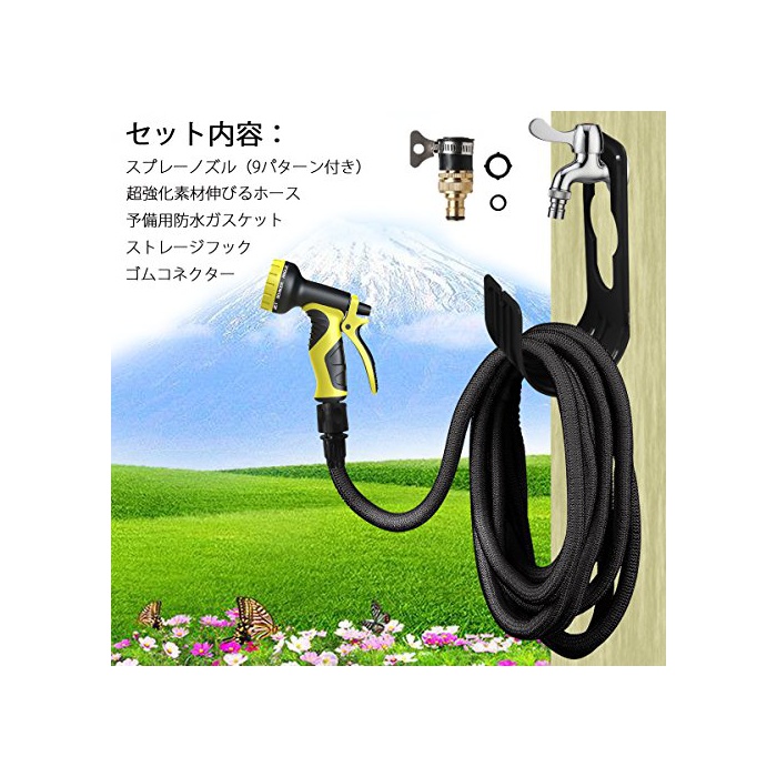 【세트의 내용】스프레이 노즐(9패턴 부착)×1;초강화 소재 성장하는 호스×1 예비용 방수 가스켓×2;storage 훅×1;고무 커넥터×1;일본어 취급 설명서