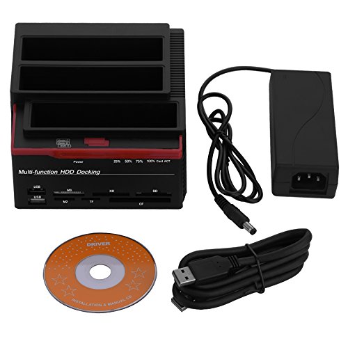 -. Feature : Universal external USB3.0 to SATA three-bay hard drive docking station. Directly plug the bare disk, no need to install, easy to use. / Support 2.5 inch & 3.5 inch IDE hard drive. Support 2.5 inch & 3.5 inch SATAI / II / III hard drive, input power: DC / 12V. / USB3.0_AF interface, USB3.0 data transfer rate up to 5Gbps. USB2.0 data transfer rate up to 480Mbps. / Simultaneously read two hard drives (6TB * 2), two USB2.0 expansion HUB interfaces. Support M2 / MS / TF / SD / MMC / MS / CF / XD slot (Max64GB memory card, NOT included) / Support: Windows2000 / XP / Vista / Win7 / 8; Linux / MAC OS. WinXP maximum support 2TB, Win7 / 8 up to 3TB or more. Support hard disk offline clone, namely, data can be copied from disc B/C to disc A while the hard disc does not connect to the computer