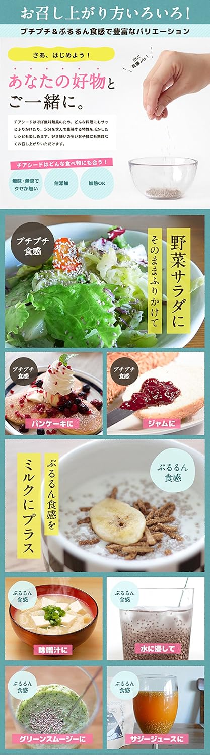 • 水分を含むとゼリー状に膨らみ、食感も楽しめます。