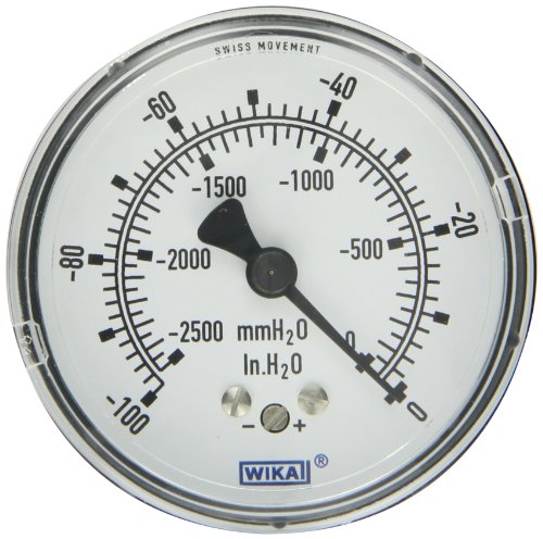 WIKA 9747465 Capsule Low Pressure Gauge, Dry-Filled, Copper Alloy Wetted Parts, 2-1/2" Dial, 0-100"WC Vacuum (mmWC) Range, +/-1.5% Accuracy, 1/4" Male NPT Connection, Center Back Mount