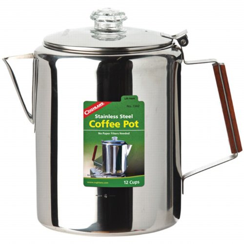 Studio : Coghlans Publisher : Coghlans Binding : Sports Product Description The Coghlans 12 Cup Stainless Steel Coffee Pot is crafted of tough 18/8 stainless steel with a glass percolator top. Precision-fit parts and seamless construction ensure lasting durability. Includes a two-piece basket percolator system. Hinged lid with a stay cool permawood handle. Dishwasher Safe. 0