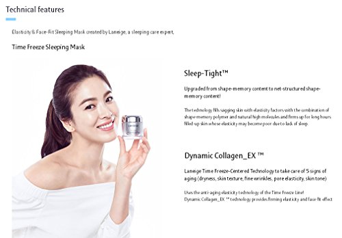 -. Feature : An anti-aging sleeping mask that improves skin firmness and facial contours overnight for a more youthful-looking face. / Upgraded from shape-memory content to net-structured shape-memory content! / Laneige Time Freeze-Centered Technology to take care of 5 signs of aging (dryness, skin texture, fine wrinkles, pore elasticity, skin tone) / For perfect elasticity and face-fit effect, use face-fit roller & sleeping mask together!