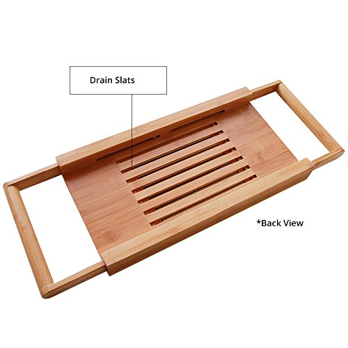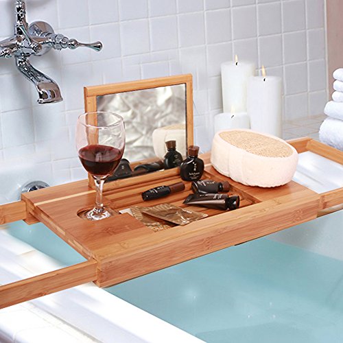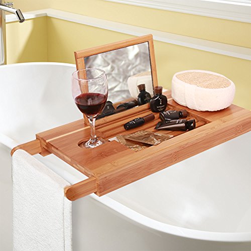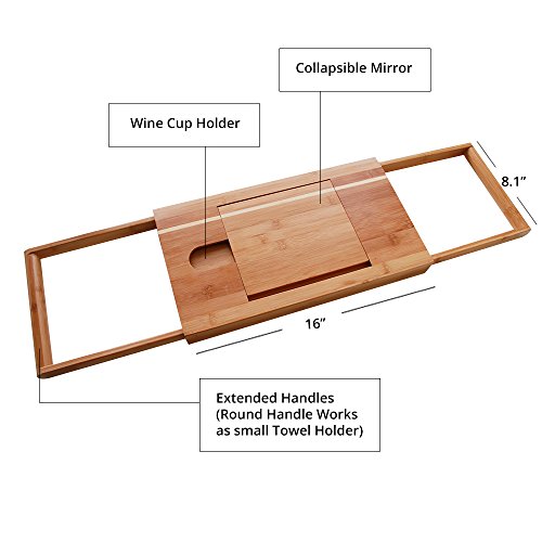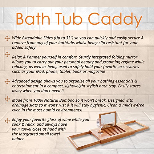 Studio : Q Technologies Publisher : Q Technologies Product Description Everything Bamboo Bathtub Caddy Tray fits almost all bathtubs with extendable sides up to 33 inches. You can quickly and easily secure remove from any of your bathtubs while being slip resistant for your added safety. With an integrated glass holder folding mirror you are able to relax pamper yourself in comfort. Folding mirror is sturdy enough to hold your iPad, tablet, phone, book and magazine. Organize all your bathing essentials entertainment in a compact, lightweight stylish bath tray. Made from 100% Natural Bamboo so it won't break. Designed with drainage slats so it won't rust it will stay hygienic, clean mildew free even in the most humid environments! 0