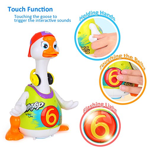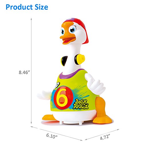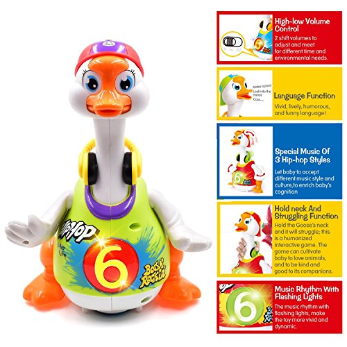Features:The goose has a universal moving function, allowing it to move around even if something were to get in the way of its dance routine, motivates baby to imitate and follow it exercising their motor ability and the development of muscles.