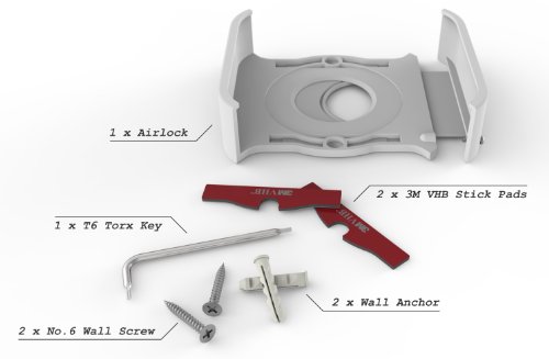 Airlock mount, unique Torx head key, 2 screws, 2 plastic anchors, 2 VHB stick pads, and assembly instructions.